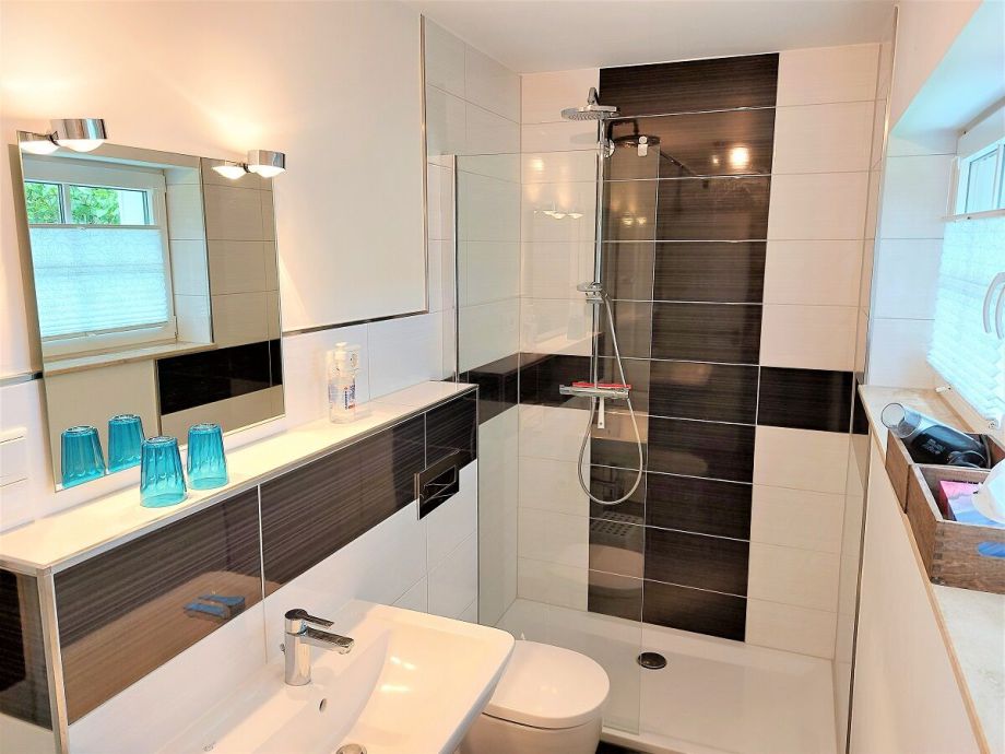 Im Erdgeschoß hat das Bad eine 80 X 160 cm große Regendusche, im Obergeschoß ist die Dusche in 70 x 140 cm groß.