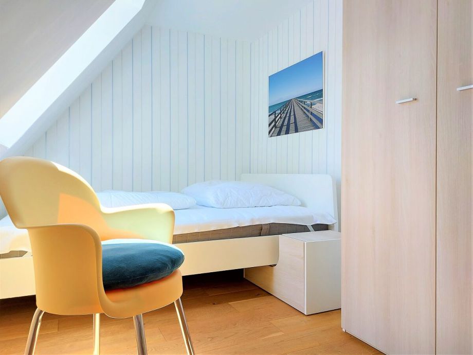 Neben dem großen Schlafzimmer mit dem Zugang zur Dachterasse sind zwei weitere Schlafzimmer mit einem Einzelbett und einem Doppelbett im OG eingerichtet. Von diesen beiden Zimmern ist eines mit einem weiteren Flachbildfernseher ausgestattet. Dieser Fernseher kann auch im großen Schlafzimmer aufgestellt werden.